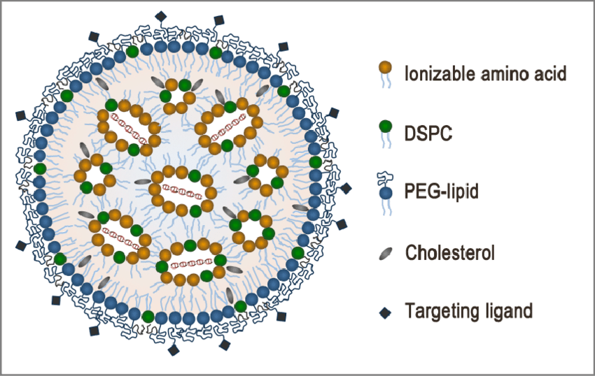 装载mRNA的LNP除了含有带负电荷的mRNA外,另有四种成分:可电离的阳离子磷脂(ionizable lipids),中性辅助磷脂(Phospholipid),胆固醇(Cholesterol),聚乙二醇修饰的磷脂(PEG-lipid)。