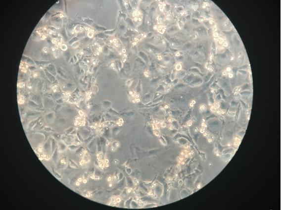 将细胞按种于事先放置于培养瓶内的盖玻片上,24h后取出,用相差油镜观察。支原体呈暗色微小颗粒位于细胞表面和细胞之间;