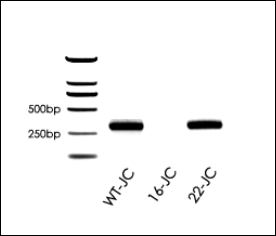 设计的junction引物位于敲除片段内外侧,野生型为模板的junction F/R扩增产物大小为281 bp。