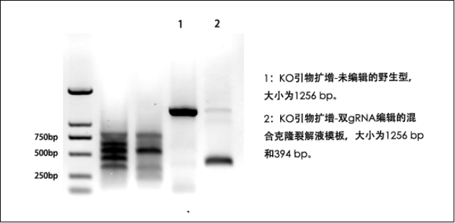 如果混合克隆中大量细胞发生了基因编辑,双gRNA编辑的混合克隆裂解液模板的扩增条带大小应为1256bp减去862bp,即394bp。经琼脂糖凝胶电泳观察到符合敲除后KO扩增产物大小的目的条带。