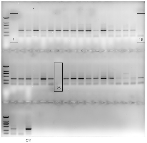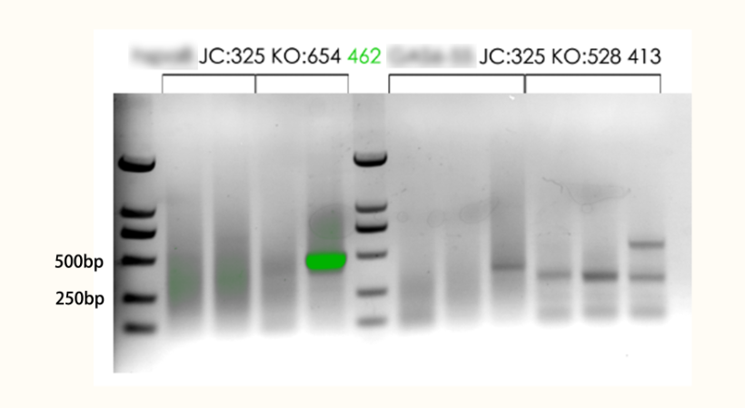 其次,对Junction引物扩增阴性的单克隆样本再使用KO引物进行扩增。根据敲除片段的大小,以及实际上可能出现的敲除方式进行检测(精确敲除或移码突变)。