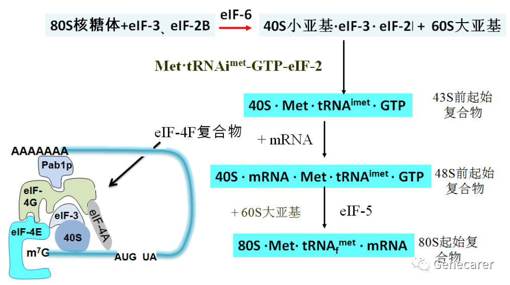 Kozak序列(通常是GCCACCatgG),真核生物mRNA真正的起始密码子位于Kozak序列的保守序列中,其共有序列是CCRCCAUGG,几乎所有mRNA的翻译起始都依赖于5’帽子结构募集小亚基,少数通过内部核糖体进入位点(IRES)募集小亚基。Kozak序列通过与翻译起始因子eIF形成翻译起始复合物,起始蛋白的翻译。