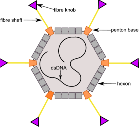 腺病毒(adenovirus,Ad)是一种球形、无包膜、直径约70~80 nm颗粒病毒,腺病毒基因组为大小为36kb的双链线性DNA,两端各有长约100 bp的反向重复序列,编码30多种”调控蛋白“。腺病毒为20面体立体对称结构,由252个壳粒组成,衣壳含有240个六连体(Hexon),12个五连体(penton)和位于表面的纤维状刺突,纤维状刺突由12根纤毛(fiber),以5连体单位为基底由衣壳表面伸出,纤毛顶端形成头结区(Knob),在病毒感染细胞过程中起着非常重要的作用。纤毛的头节区粘附到细胞表面的特异性受体介导的内吞作用进入细胞,而后腺病毒基因组转移至细胞核内,游离于染色体外,但不整合进入宿主细胞基因组。腺病毒已知有52种,分别命名为adl-ad52,研究得最详细是ad2和ad5,广泛应用于疫苗和体外体内基因转导等领域。