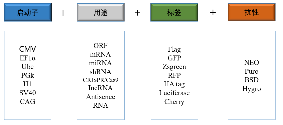 基恩科生物(GeneCarer)提供各种载体可供选择,不同启动子,不同筛选标记,不同标签蛋白。