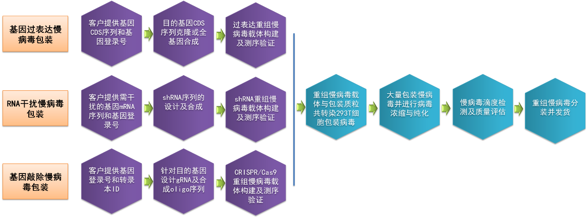 基恩科生物(GeneCarer)提供非整合慢病毒现货定制服务,提供基因(含circRNA 、lncRNA、microRNA等)过表达、基因干扰、基因敲除慢病毒,具体实验服务流程如下图: