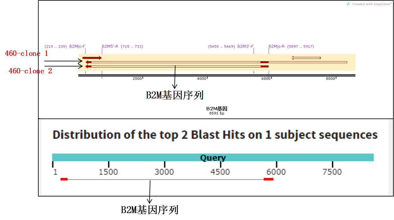 B2M基因敲除双gRNA/Cas9载体构建blast分析(红色箭头为gRNA序列)