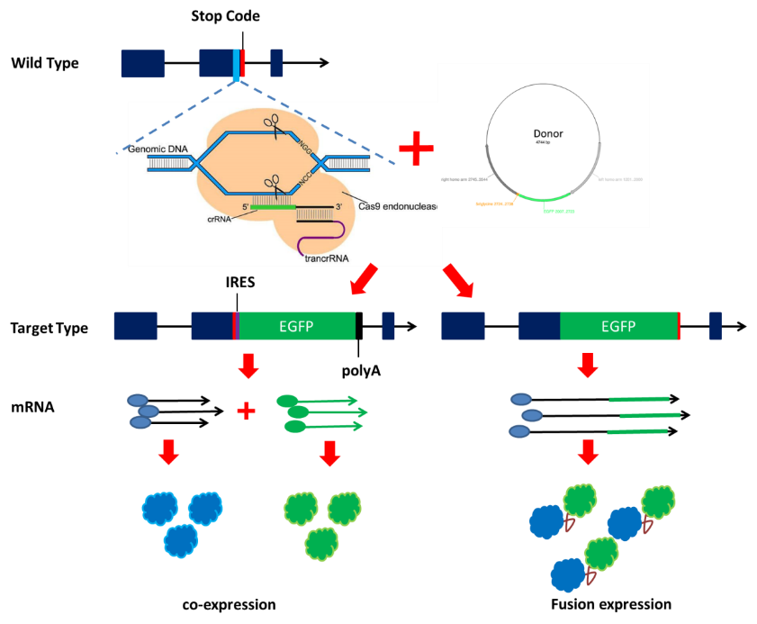 采用CRISPR/Cas9系统进行目的基因(外源基因,抗性基因和荧光标志等)的定点敲入,是通过提供外源模板(Donor载体)依靠细胞自身的修复机制NHEJ(非同源末端连接)和HDR(同源同组)完成的。在哺乳动物细胞中,CRISPR/Cas9介导的NHEJ对标记基因的插入概率明显高于HDR修复机制。我们的技术团队在以NHEJ介导的目的基因敲入细胞株构建中具有丰富的经验,可实现敲入概率30%以上,通过抗性筛选后的基因敲入概率可达80%以上。