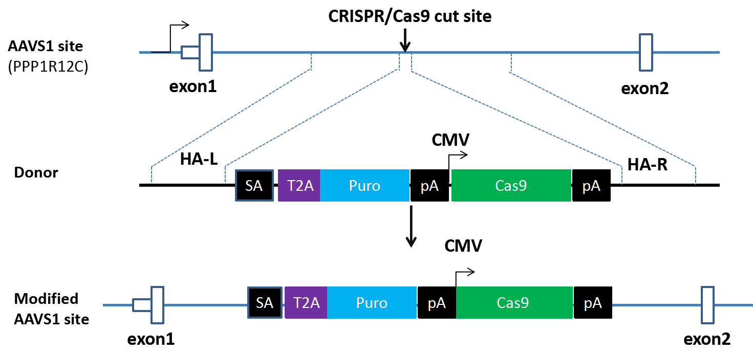 293T-AAVS1-Cas9细胞株是采用CRISPR技术介导的基因同源重组构建的,基因插入位点位于人PPP1R12C基因的第一个内含子上(AAVS1位点)。在该位点中插入外源基因片段具有稳定表达、不影响其他基因转录的优点。与慢病毒感染技术相比,AAVS1位点基因插入稳定表达,可以有效控制目的基因表达水平,实现目的基因单、双拷贝以及细胞生理水平表达等,弥补慢病毒感染细胞中目的基因表达拷贝数不确定,表达水平不可控的缺点。