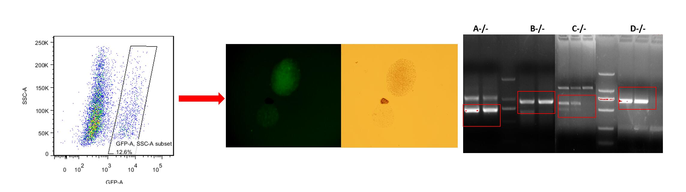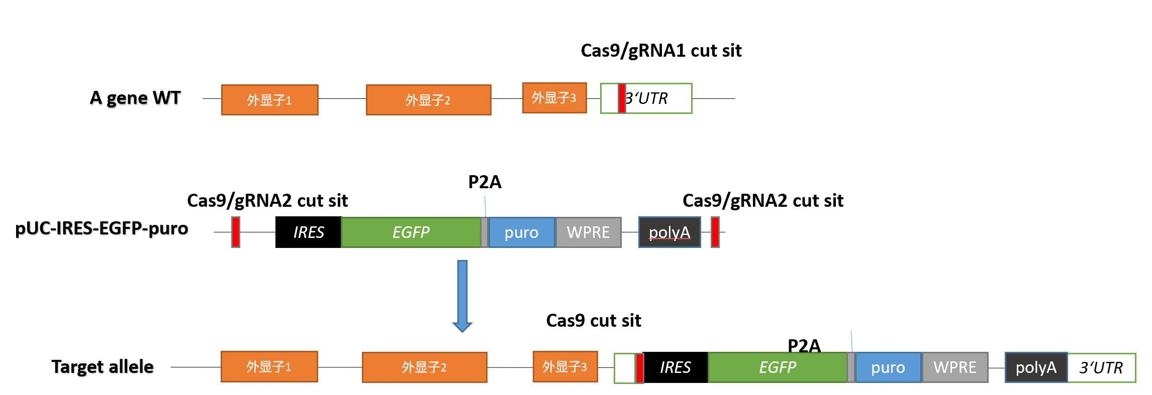 Hul-7 细胞A基因3‘UTR区域插入IRES-GFP序列,通过切口末端拼接的方式将GFP插入到目的基因的3‘UTR区域,双gRNA系统,Cas9/gRNA 1介导基因组目的片段切割,Cas9/gRNA 2介导Donor载体,双载体共转染Hul-7细胞,流式细胞分选GFP+细胞,单克隆收集并鉴定。
