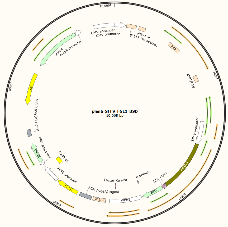 plenti-SFFV-FGL1-BSD是以基恩科生物自研慢病毒骨架载体pLenti-SFFV-MCS-Puro为骨架载体构建,过表达人小鼠FGL1基因,与载体PMD2.G和Pspax2配套进行慢病毒包装。