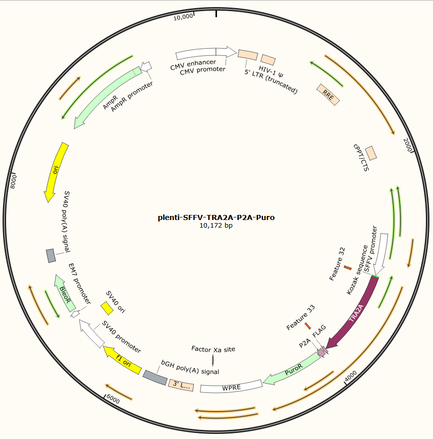 plenti-SFFV-TRA2A-P2A-Puro是以基恩科生物自研慢病毒骨架载体Lenti-SFFV-MCS-Puro为骨架载体构建,过表达人TRA2A基因,与载体PMD2.G和Pspax2配套进行慢病毒包装。