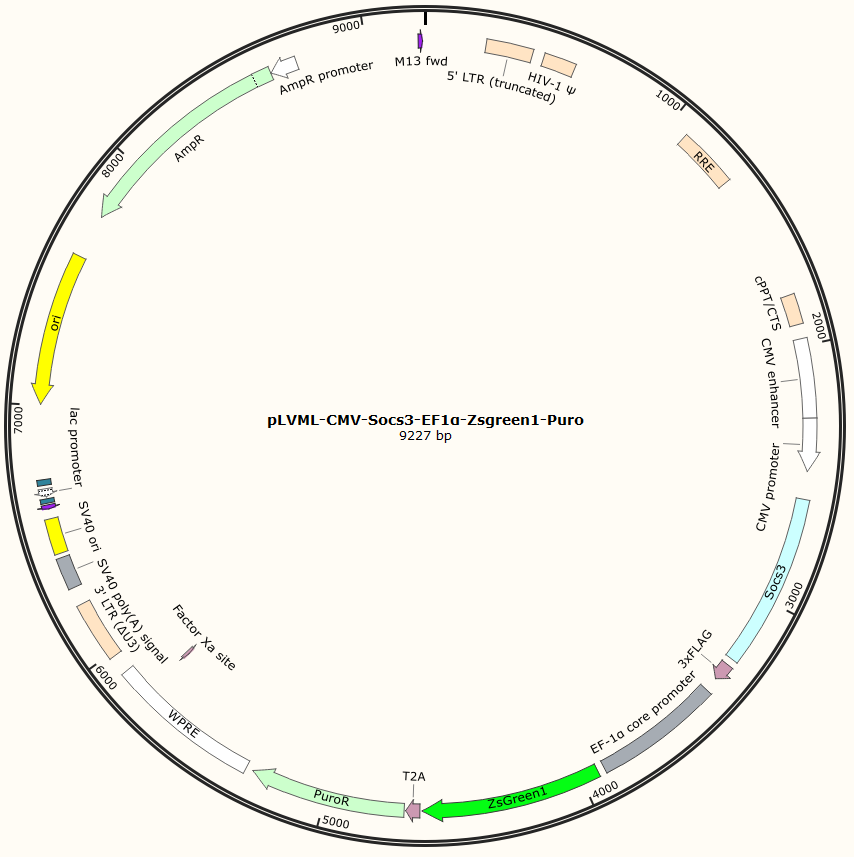 | GC020400723 | pLVML-CMV-Socs3-EF1α-Zsgreen1-Puro | 2μg | Socs3基因过表达 | 800.00 | 2-3天 |