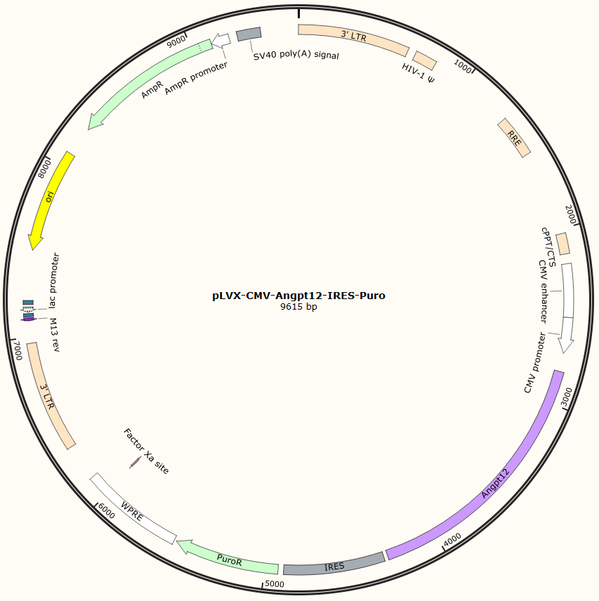pLVX-CMV-Angpt12-IRES-Puro是以基恩科生物自研慢病毒骨架载体pLVX-CMV-MCS-IRES-Puro为骨架载体构建,过表达小鼠Angpt12基因,与载体PMD2.G和Pspax2配套进行慢病毒包装。