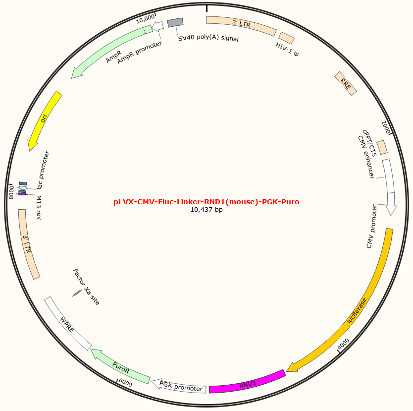 pLVX-CMV-Fluc-Linker-RND1(mouse)-PGK-Puro是以基恩科生物自研慢病毒骨架载体pLVX-CMV-Fluc-Linker-MCS-PGK-Puro为骨架载体构建,过表达小鼠MDM2基因,与载体PMD2.G和Pspax2配套进行慢病毒包装。