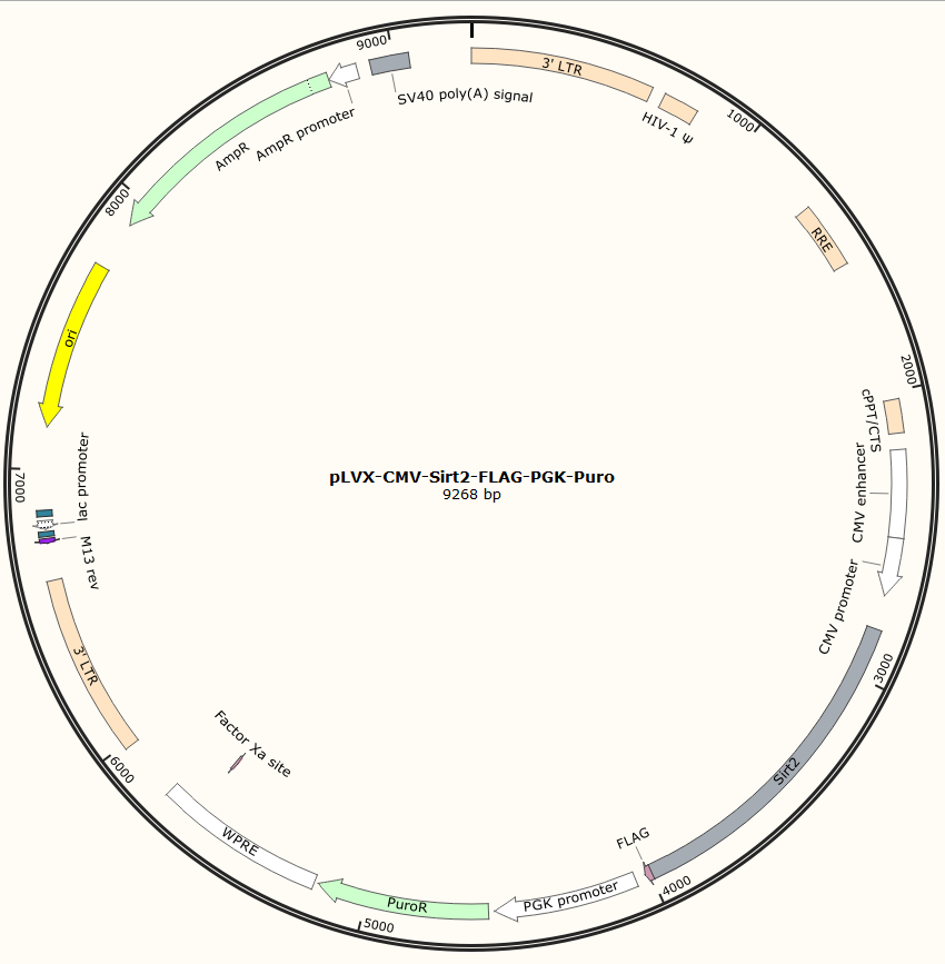 pLVX-CMV-Sirt2-FLAG-PGK-Puro是以基恩科生物自研慢病毒骨架载体pLVX-CMV-MCS-FLAG-PGK-Puro为骨架载体构建,过表达小鼠Sirt2基因,与载体PMD2.G和Pspax2配套进行慢病毒包装。