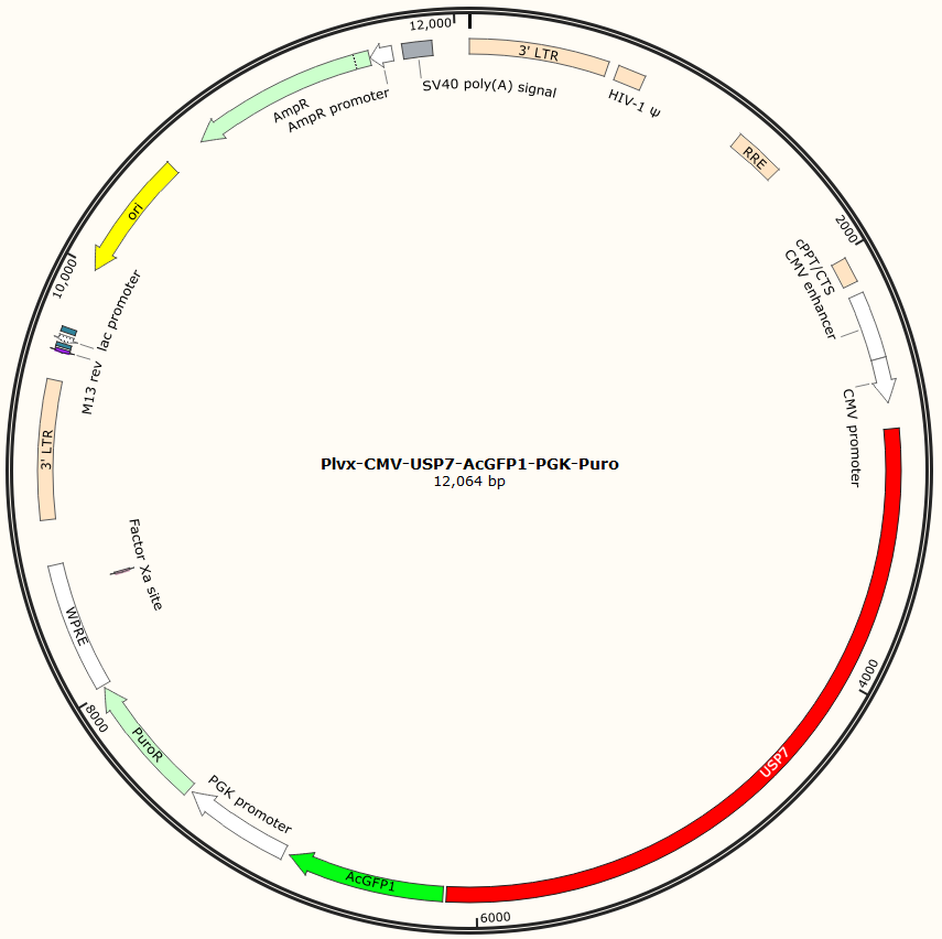 PLVX-CMV-USP7-AcGFP1-PGK-Puro是以基恩科生物自研慢病毒骨架载体PLVX-CMV-MCS-AcGFP1-PGK-Puro为骨架载体构建,过表达小鼠USP7基因,与载体PMD2.G和Pspax2配套进行慢病毒包装。