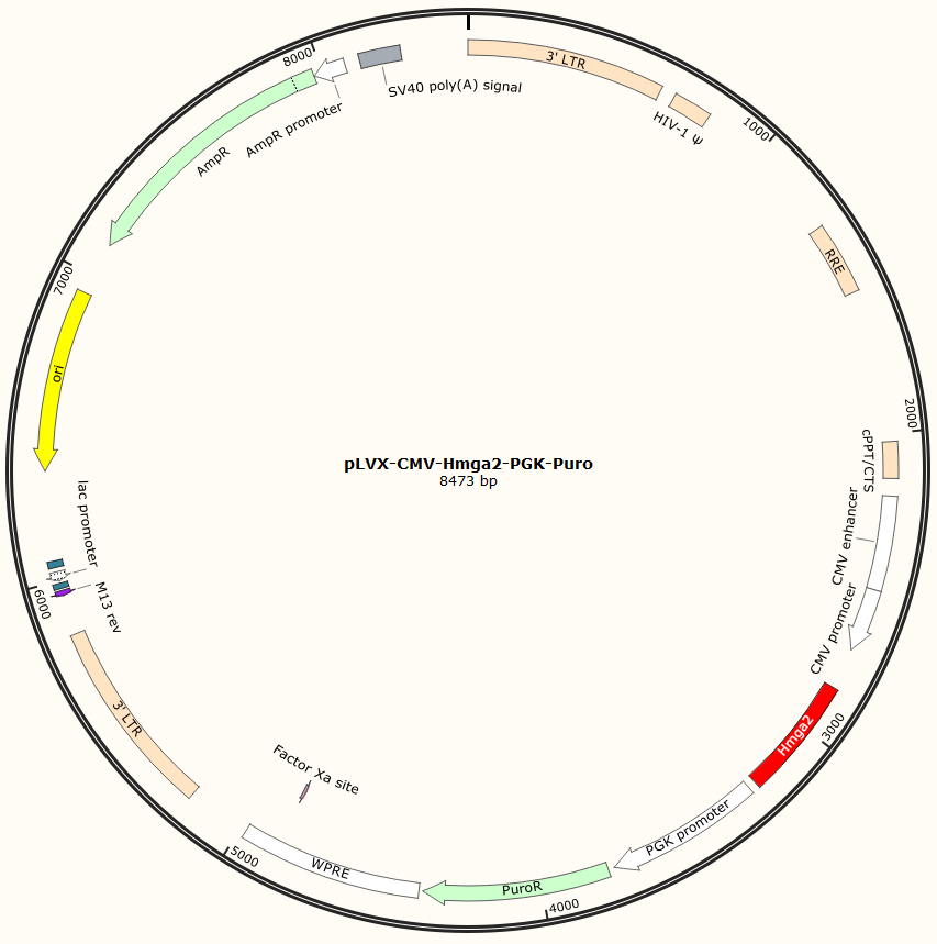 pLVX-CMV-Hmga2-PGK-Puro是以基恩科生物自研慢病毒骨架载体pLVX-CMV-MCS-PGK-Puro为骨架载体构建,过表达小鼠Hmga2基因,与载体PMD2.G和Pspax2配套进行慢病毒包装。