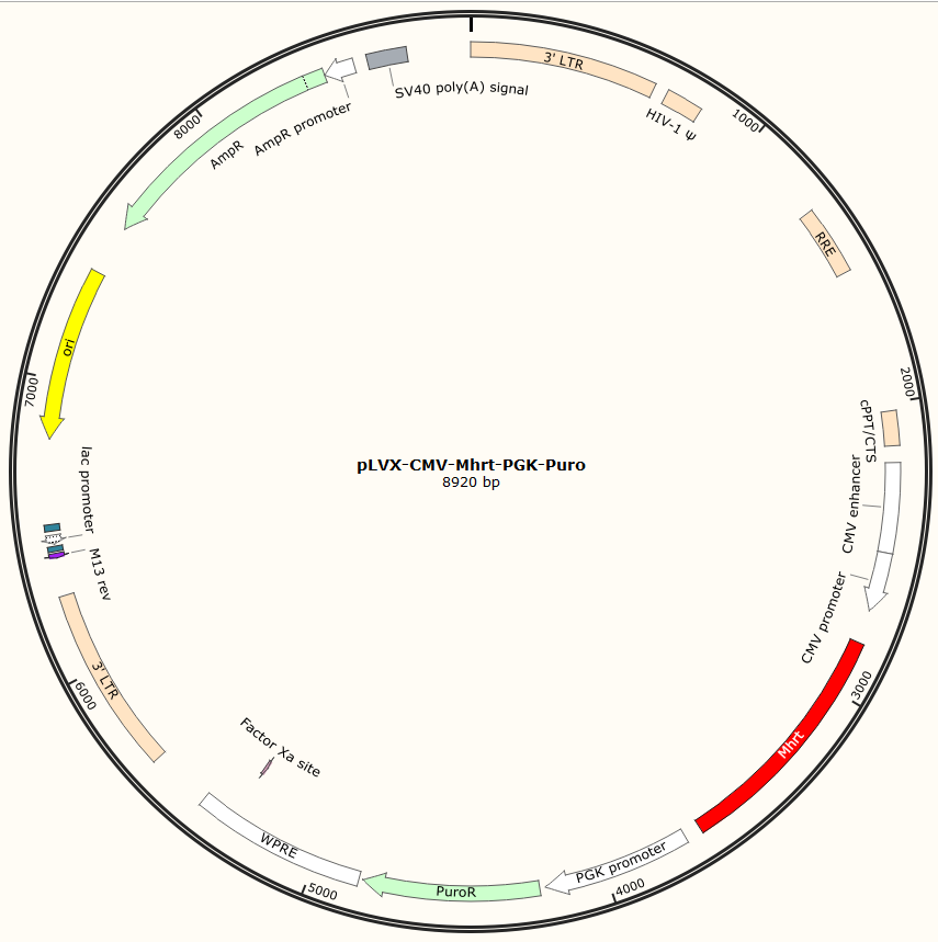 pLVX-CMV-Mhrt-PGK-Puro是以基恩科生物自研慢病毒骨架载体pLVX-CMV-MCS-PGK-Puro为骨架载体构建,过表达小鼠Mhrt基因,与载体PMD2.G和Pspax2配套进行慢病毒包装。