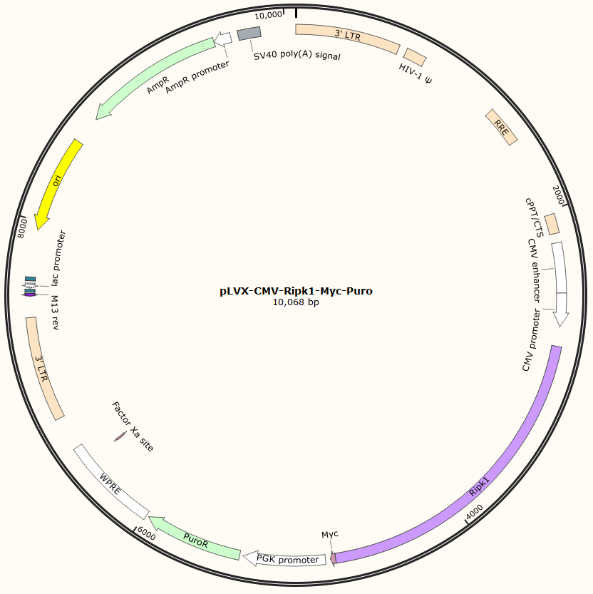 pLVX-CMV-Ripk1-Myc-Puro是以基恩科生物自研慢病毒骨架载体pLVX-CMV-MCS-Myc-Puro为骨架载体构建,过表达小鼠Ripk1基因,与载体PMD2.G和Pspax2配套进行慢病毒包装。