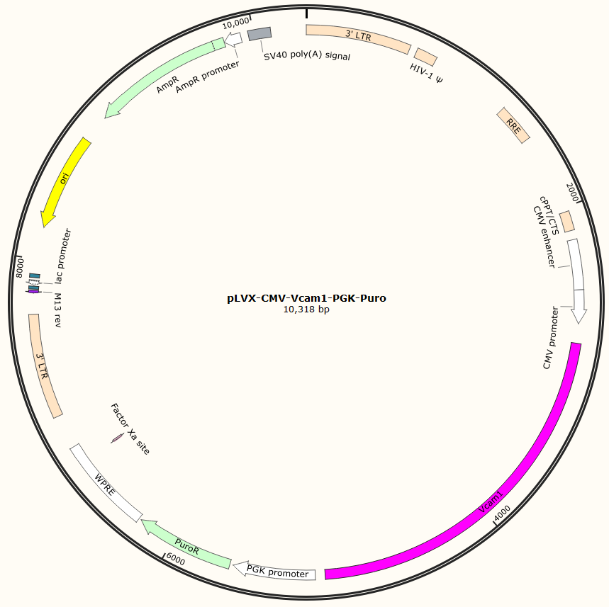 pLVX-CMV-Vcam1-PGK-Puro是以基恩科生物自研慢病毒骨架载体pLVX-CMV-MCS-PGK-Puro为骨架载体构建,过表达小鼠Vcam1基因,与载体PMD2.G和Pspax2配套进行慢病毒包装。
