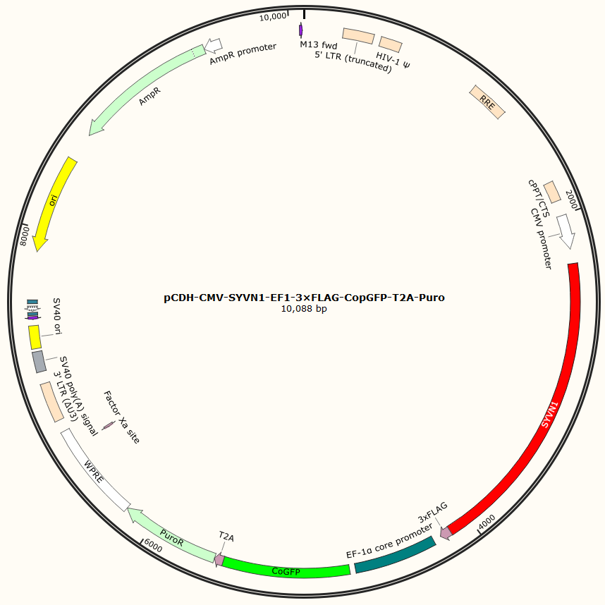 pCDH-CMV-SYVN1-EF1-3×FLAG-CopGFP-T2A-Puro是以基恩科生物自研慢病毒骨架载体pCDH-CMV-MCS-EF1-3×FLAG-CopGFP-T2A-Puro为骨架载体构建,过表达小鼠SYVN1基因,与载体PMD2.G和Pspax2配套进行慢病毒包装。