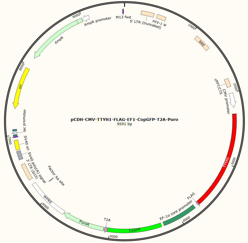 pCDH-CMV-TTYH1-FLAG-EF1-CopGFP-T2A-Puro是以基恩科生物自研慢病毒骨架载体pCDH-CMV-MCS-FLAG-EF1-CopGFP-T2A-Puro为骨架载体构建,过表达小鼠TTYH1基因,与载体PMD2.G和Pspax2配套进行慢病毒包装。