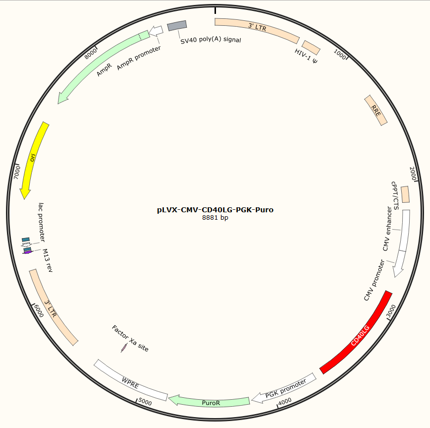 pLVX-CMV-CD40LG-PGK-Puro是以基恩科生物自研慢病毒骨架载体pLVX-CMV-MCS-PGK-Puro为骨架载体构建,过表达小鼠CD40LG基因,与载体PMD2.G和Pspax2配套进行慢病毒包装。