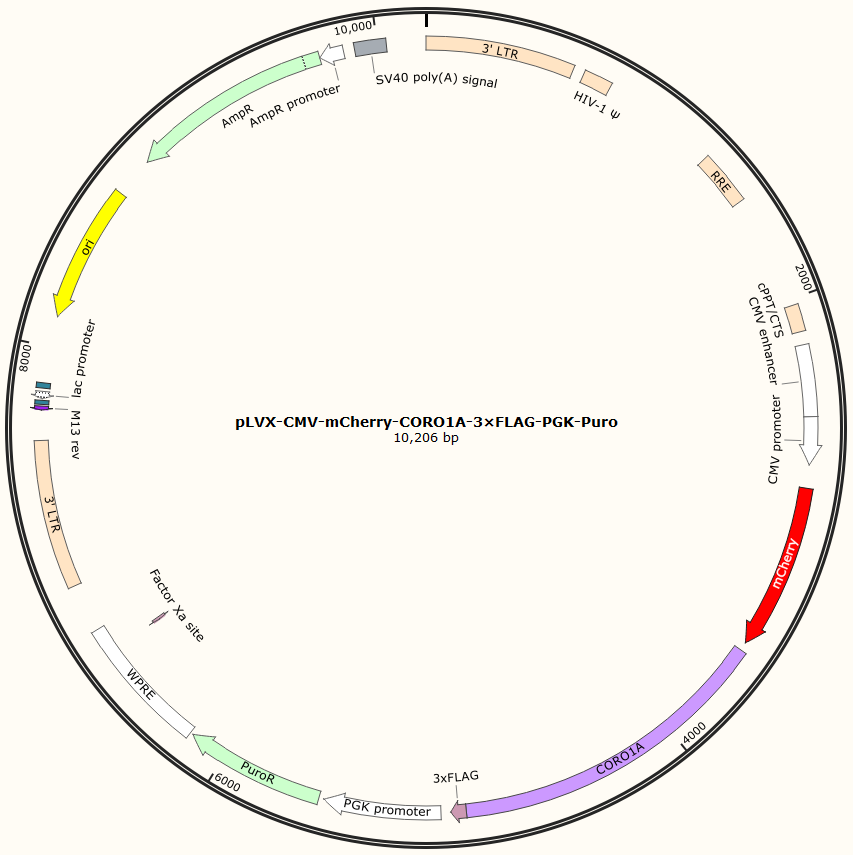 pLVX-CMV-mCherry-CORO1A-3×FLAG-PGK-Puro是以基恩科生物自研慢病毒骨架载体pLVX-CMV-mCherry-MCS-3×FLAG-PGK-Puro为骨架载体构建,过表达小鼠CORO1A基因,与载体PMD2.G和Pspax2配套进行慢病毒包装。