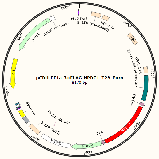 pCDH-EF1a-3×FLAG-NPDC1-T2A-Puro是以基恩科生物自研慢病毒骨架载体pCDH-EF1a-3×FLAG-MCS-T2A-Puro为骨架载体构建,过表达小鼠NPDC1基因,与载体PMD2.G和Pspax2配套进行慢病毒包装。