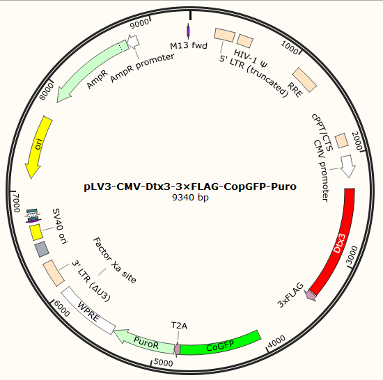 pLV3-CMV-Dtx3-3×FLAG-CopGFP-Puro是以基恩科生物自研慢病毒骨架载体pLV3-CMV-MCS-3×FLAG-CopGFP-Puro为骨架载体构建,过表达小鼠Dtx3基因,与载体PMD2.G和Pspax2配套进行慢病毒包装。
