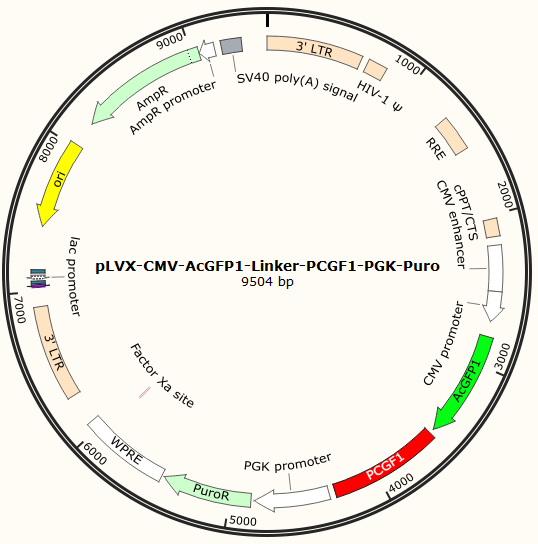 | GC020400832 | pLVX-CMV-AcGFP1-Linker-PCGF1-PGK-Puro | 2μg | PCGF1基因过表达 | 800.00 | 3-4天 |