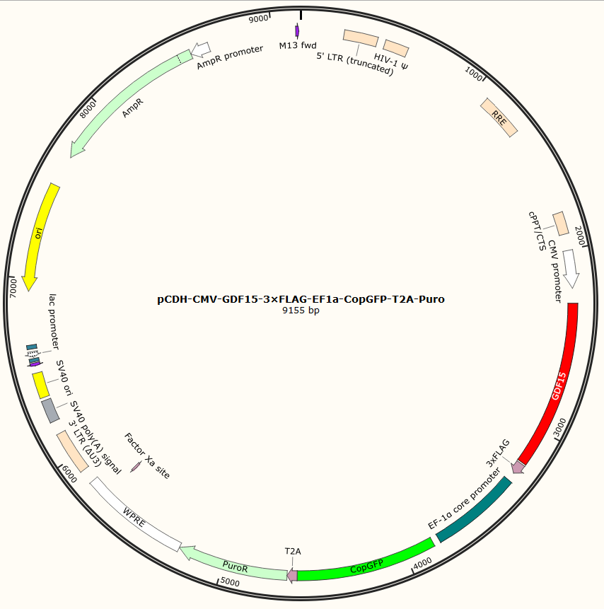 pCDH-CMV-GDF15-3×FLAG-EF1a-CopGFP-T2A-Puro是以基恩科生物自研慢病毒骨架载体pCDH-CMV-MCS-EF1-Puro为骨架载体构建,过表达小鼠GDF15基因,与载体PMD2.G和Pspax2配套进行慢病毒包装。