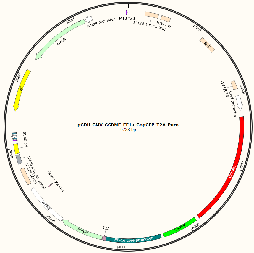 pCDH-CMV-GSDME-EF1a-CopGFP-T2A-Puro是以基恩科生物自研慢病毒骨架载体pCDH-CMV-MCS-EF1-Puro为骨架载体构建,过表达小鼠GSDME基因,与载体PMD2.G和Pspax2配套进行慢病毒包装。