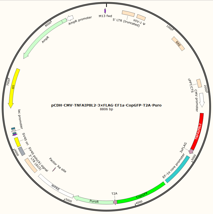 pCDH-CMV-TNFAIP8L2-3×FLAG-EF1a-CopGFP-T2A-Puro是以基恩科生物自研慢病毒骨架载体pCDH-CMV-MCS-EF1-Puro为骨架载体构建,过表达小鼠TNFAIP8L2基因,与载体PMD2.G和Pspax2配套进行慢病毒包装。