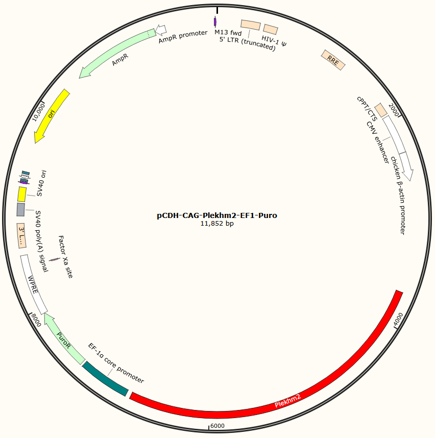 pCDH-CAG-Plekhm2-EF1-Puro是以基恩科生物自研慢病毒骨架载体pCDH-CAG-MCS-EF1-Puro为骨架载体构建,过表达小鼠Plekhm2基因,与载体PMD2.G和Pspax2配套进行慢病毒包装。