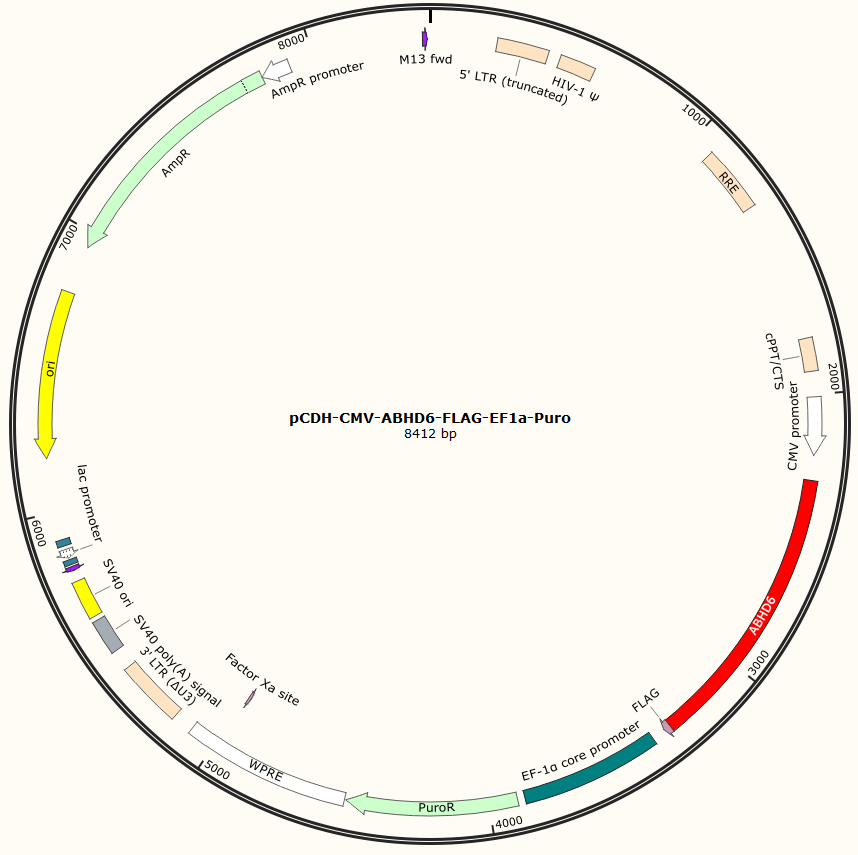 pCDH-CMV-ABHD6-FLAG-EF1a-Puro是以基恩科生物自研慢病毒骨架载体pCDH-CMV-MCS-EF1-Puro为骨架载体构建,过表达小鼠ABHD6基因,与载体PMD2.G和Pspax2配套进行慢病毒包装。