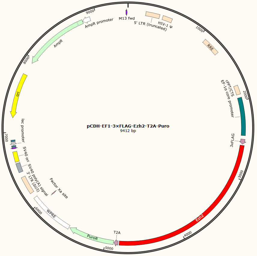 pCDH-EF1-3×FLAG-Ezh2-T2A-Puro是以基恩科生物自研慢病毒骨架载体pCDH-EF1-3×FLAG-MCS-T2A-Puro为骨架载体构建,过表达小鼠Ezh2基因,与载体PMD2.G和Pspax2配套进行慢病毒包装。