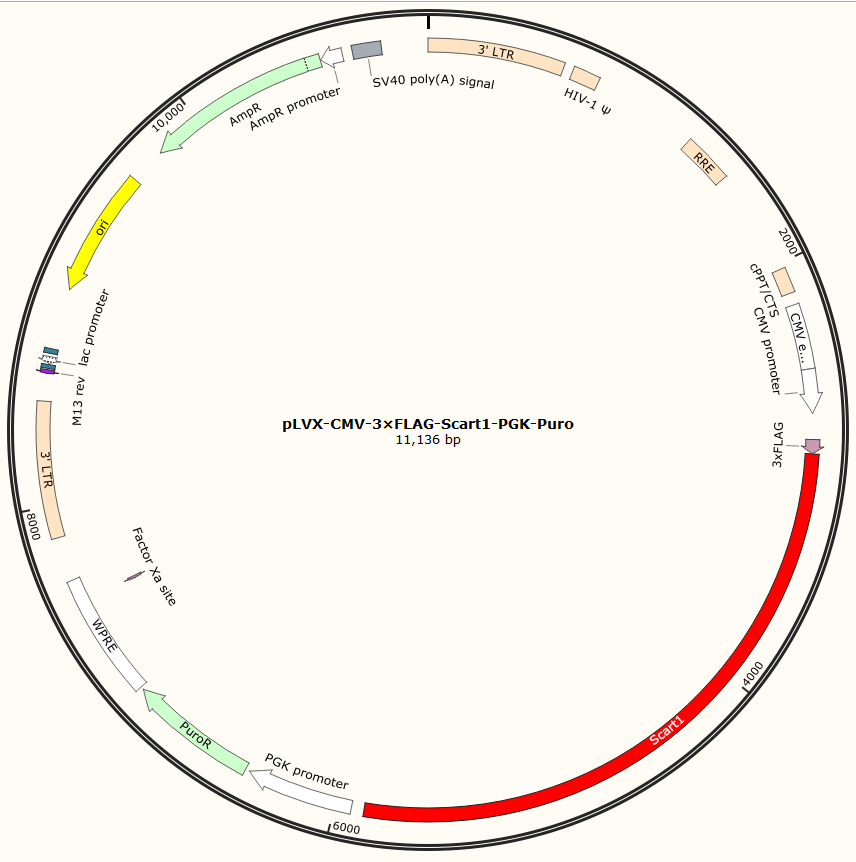 pLVX-CMV-3×FLAG-Scart1-PGK-Puro是以基恩科生物自研慢病毒骨架载体pLVX-CMV-3×FLAG-MCS-PGK-Puro为骨架载体构建,过表达小鼠Scart1基因,与载体PMD2.G和Pspax2配套进行慢病毒包装。