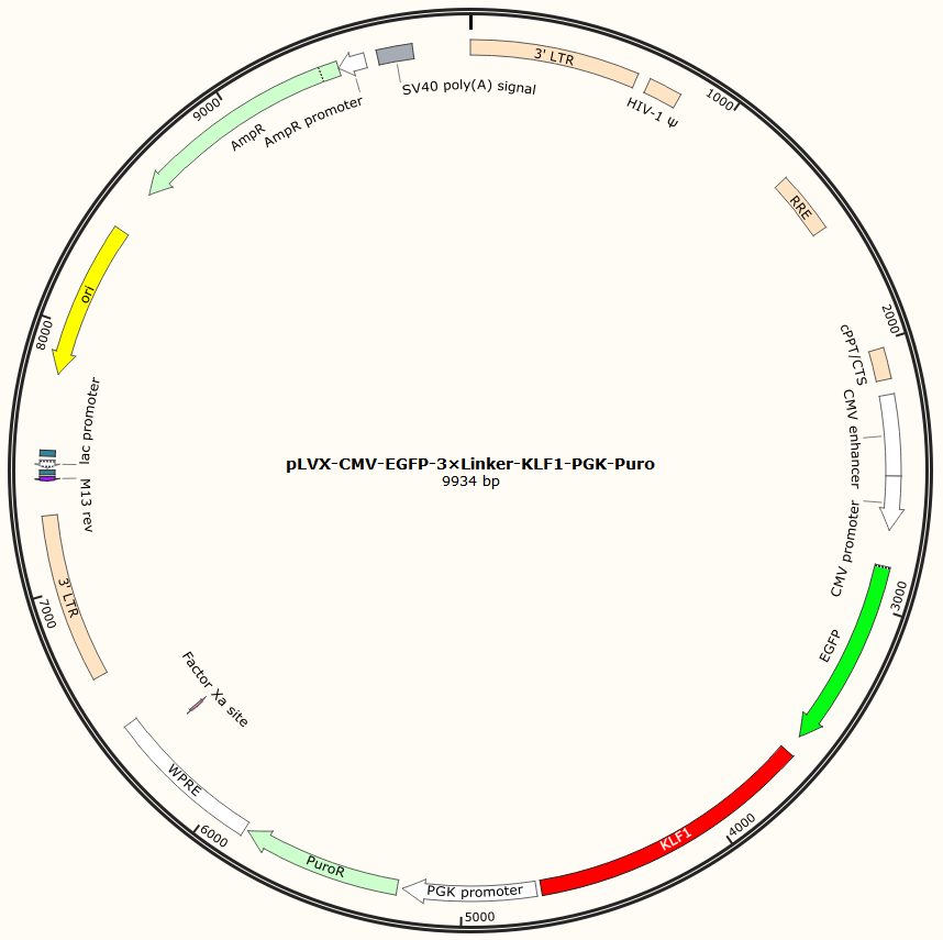 pLVX-CMV-EGFP-3×Linker-KLF1-PGK-Puro是以基恩科生物自研慢病毒骨架载体pLVX-CMV-EGFP-3×Linker-MCS-PGK-Puro为骨架载体构建,过表达小鼠KLF1基因,与载体PMD2.G和Pspax2配套进行慢病毒包装。