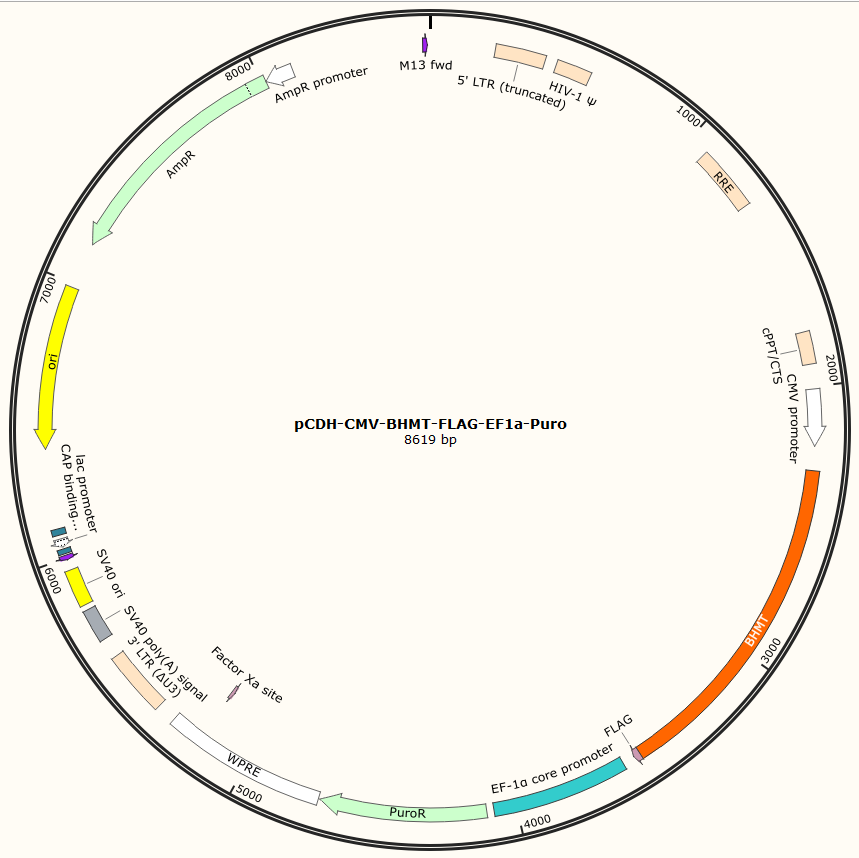 | GC020400914 | pCDH-CMV-BHMT-FLAG-EF1a-Puro | 2μg | BHMT基因过表达 | 800.00 | 2-3天 |