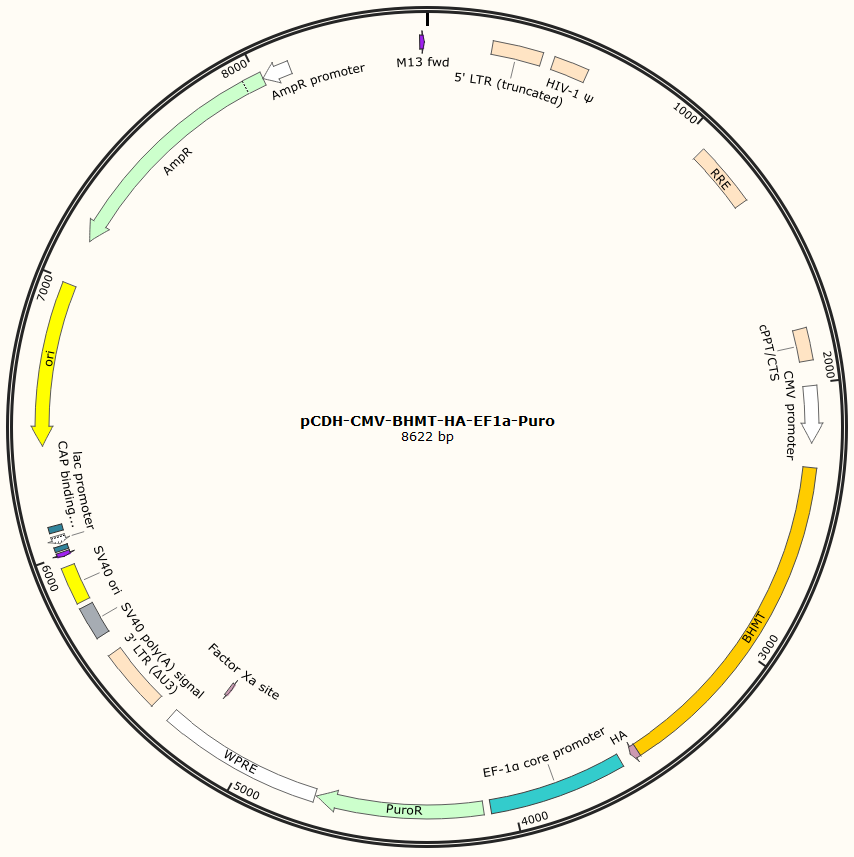 | GC020400902 | pCDH-CMV-BHMT-HA-EF1a-Puro | 2μg | BHMT基因过表达 | 800.00 | 2-3天 |