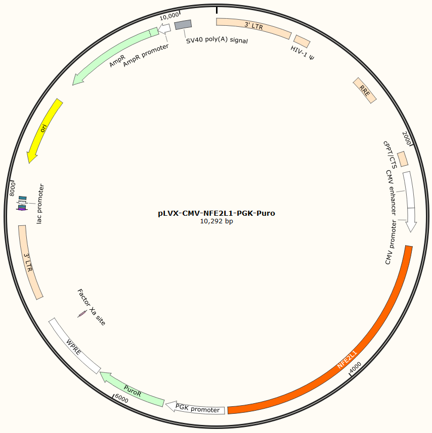 pLVX-CMV-NFE2L1-PGK-Puro是以基恩科生物自研慢病毒骨架载体pLVX-CMV-MCS-PGK-Puro为骨架载体构建,过表达小鼠NFE2L1基因,与载体PMD2.G和Pspax2配套进行慢病毒包装。