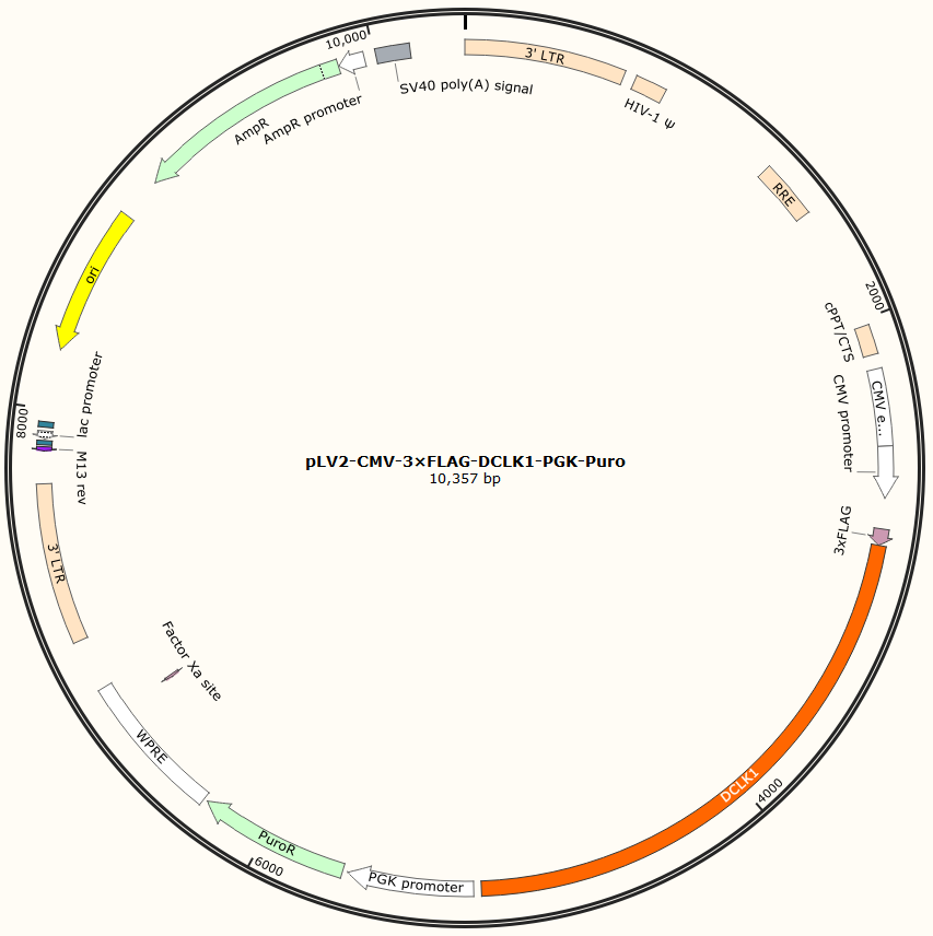 pLV2-CMV-3×FLAG-DCLK1-PGK-Puro是以基恩科生物自研慢病毒骨架载体pLV2-CMV-3×FLAG-MCS-PGK-Puro为骨架载体构建,过表达小鼠DCLK1基因,与载体PMD2.G和Pspax2配套进行慢病毒包装。