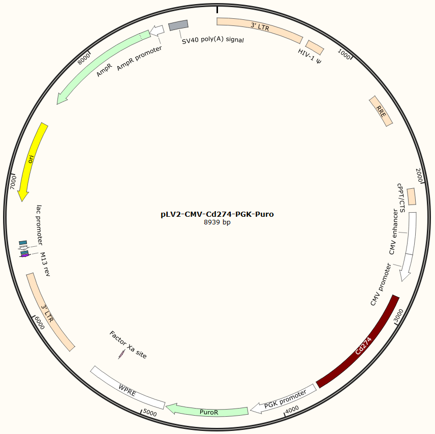 pLV2-CMV-Cd274-PGK-Puro是以基恩科生物自研慢病毒骨架载体pLV2-CMV-MCS-PGK-Puro为骨架载体构建,过表达小鼠Cd274基因,与载体PMD2.G和Pspax2配套进行慢病毒包装。