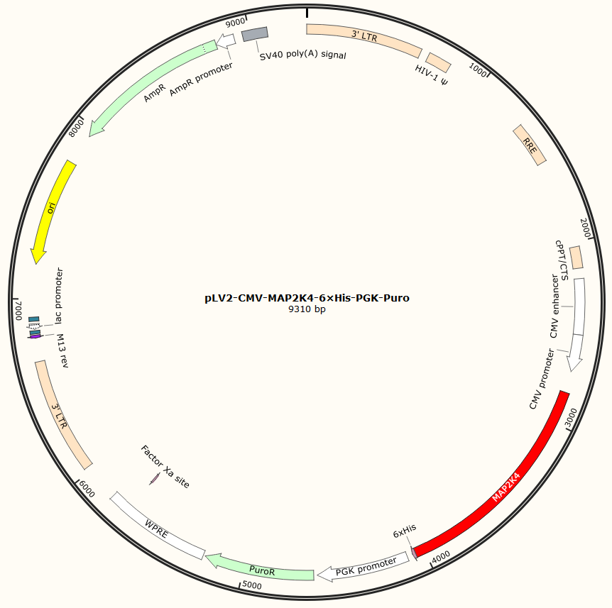 pLV2-CMV-MAP2K4-6×His-PGK-Puro是以基恩科生物自研慢病毒骨架载体pLV2-CMV-MCS-6×His-PGK-Puro为骨架载体构建,过表达小鼠MAP2K4基因,与载体PMD2.G和Pspax2配套进行慢病毒包装。