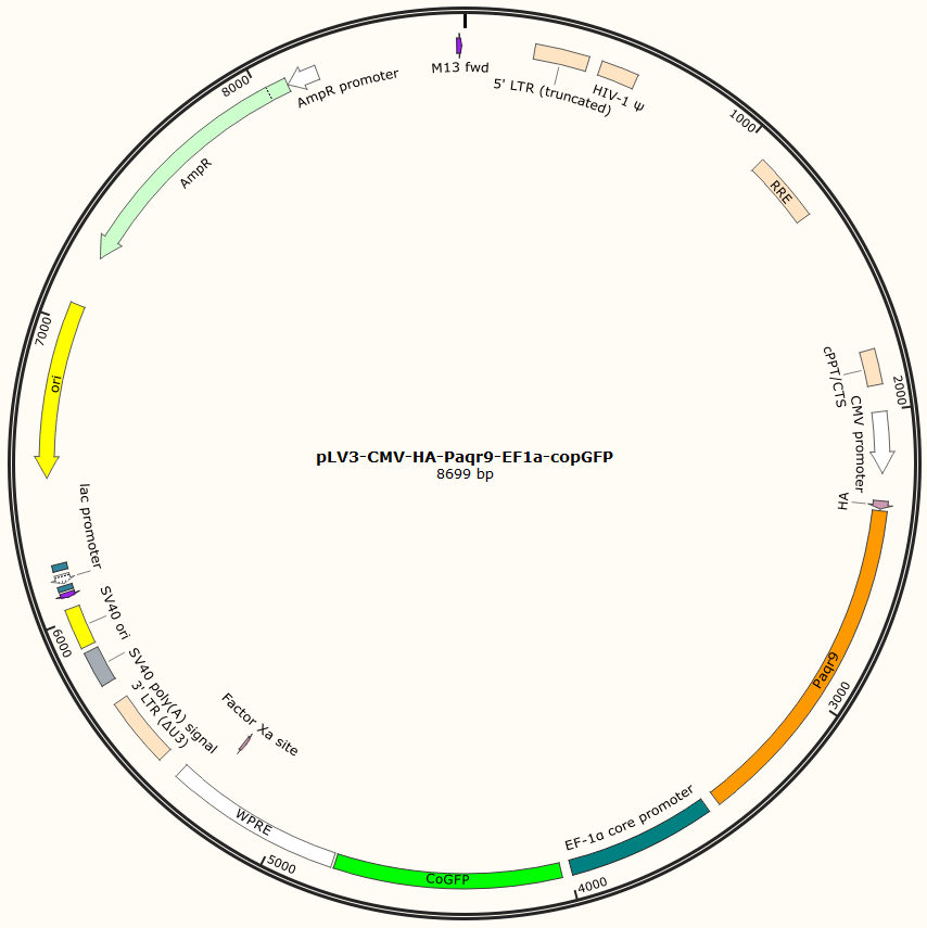 pLV3-CMV-HA-Paqr9-EF1a-copGFP是以基恩科生物自研慢病毒骨架载体pLV3-CMV-HA-MCS-EF1a-copGFP为骨架载体构建,过表达小鼠Paqr9基因,与载体PMD2.G和Pspax2配套进行慢病毒包装。