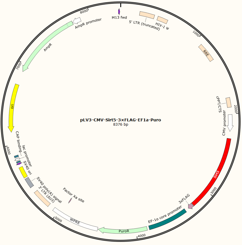 pLV3-CMV-Sirt5-3×FLAG-EF1a-Puro是以基恩科生物自研慢病毒骨架载体pLV3-CMV-MCS-3×FLAG-EF1a-Puro为骨架载体构建,过表达小鼠Sirt5基因,与载体PMD2.G和Pspax2配套进行慢病毒包装。