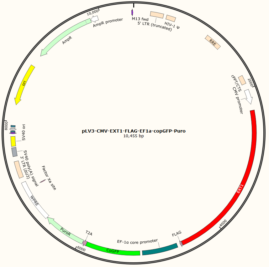 pLV3-CMV-EXT1-FLAG-EF1a-copGFP-Puro是以基恩科生物自研慢病毒骨架载体pLV3-CMV-MCS-FLAG-EF1a-copGFP-Puro为骨架载体构建,过表达小鼠EXT1基因,与载体PMD2.G和Pspax2配套进行慢病毒包装。