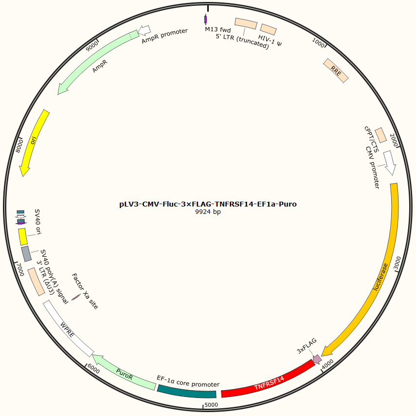 pLV3-CMV-Fluc-3×FLAG-TNFRSF14-EF1a-Puro是以基恩科生物自研慢病毒骨架载体pLV3-CMV-Fluc-3×FLAG-MCS-EF1a-Puro为骨架载体构建,过表达小鼠TNFRSF14基因,与载体PMD2.G和Pspax2配套进行慢病毒包装。