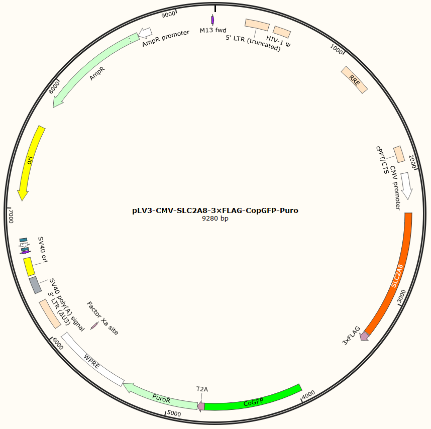 pLV3-CMV-SLC2A8-3×FLAG-CopGFP-Puro是以基恩科生物自研慢病毒骨架载体pLV3-CMV-MCS-3×FLAG-CopGFP-Puro为骨架载体构建,过表达小鼠SLC2A8基因,与载体PMD2.G和Pspax2配套进行慢病毒包装。